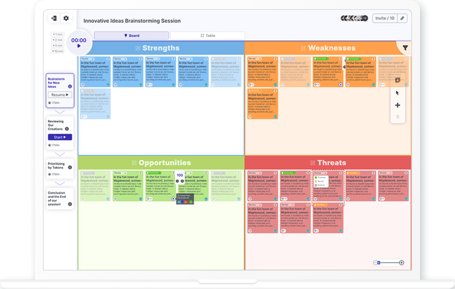 Structured whiteboards promote top ideas through stages. Integrates with the platform for real-time brainstorming.